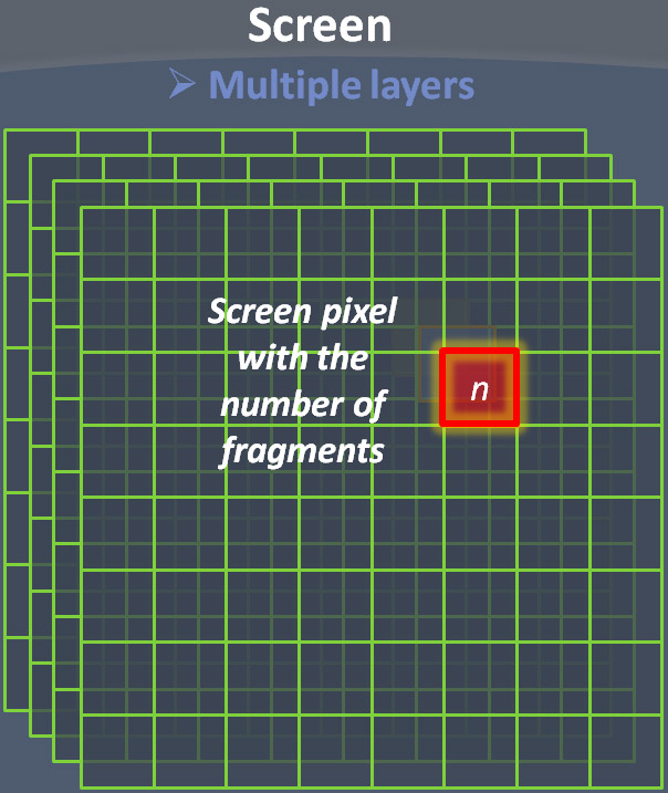 The main problem with my first ABuffer implementation (cf. my previous post) was that a fixed maximum number of fragments per pixel has to be allocated at initialization time. With this approach, the size of the ABuffer can quickly become very large when the screen resolution and depth complexity of the scene increase.